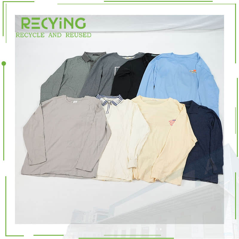 These second-hand long T-shirts are ideal for cooler weather. Available in various colors and designs, they are perfect for casual wear and offered in bulk for wholesale resale.